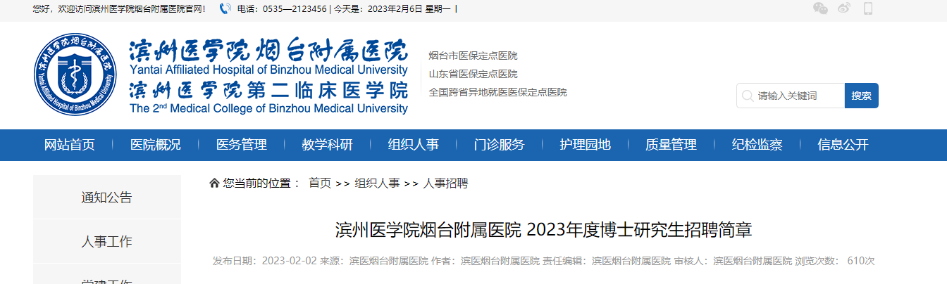 2023山東濱州醫(yī)學(xué)院煙臺(tái)附屬醫(yī)院博士研究生招聘,學(xué)歷要求:博士研究生,專(zhuān)業(yè)對(duì)口,名額不限,現(xiàn)將招聘公告原文發(fā)布如下: