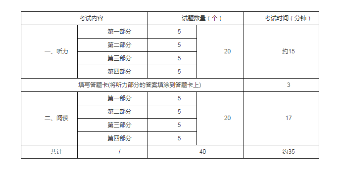 HSK(一級)共40題,分聽力、閱讀兩部分。