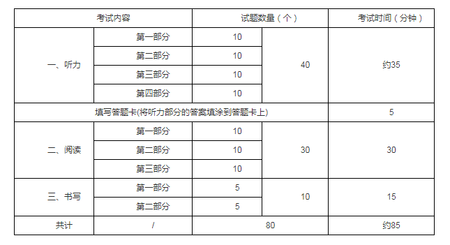 HSK(三級)共80題,分聽力、閱讀、書寫三部分。