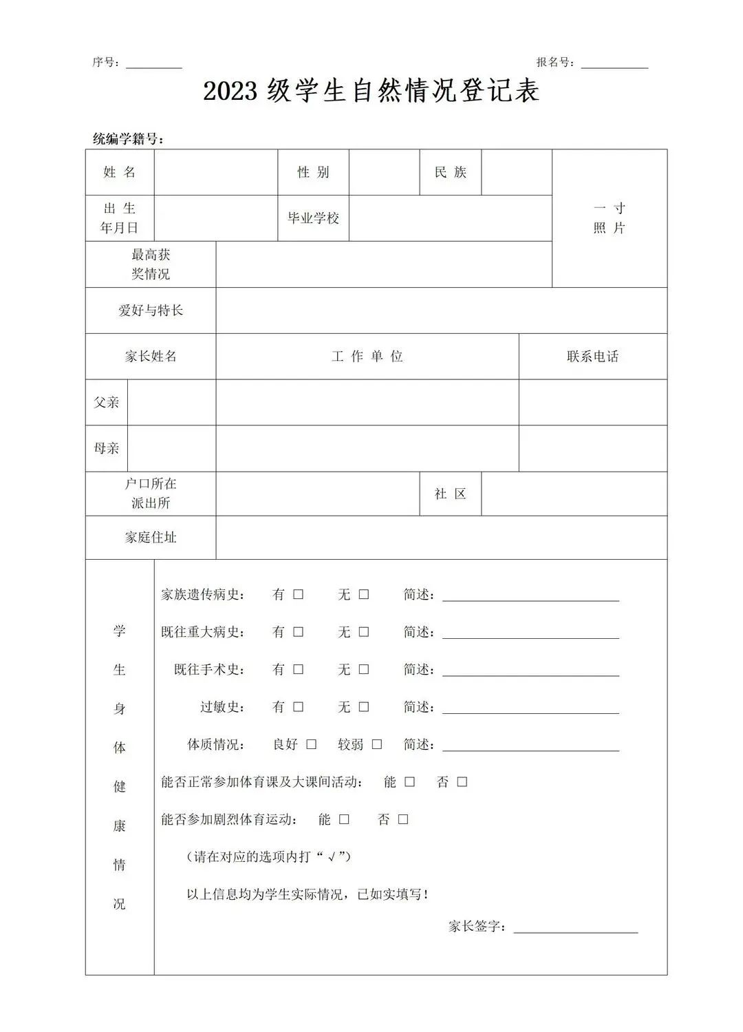 2、注冊時需攜帶:附件1《沈東中學2023級學生自然情況登記表》(下載后A4紙打印,自行填寫并簽字)。