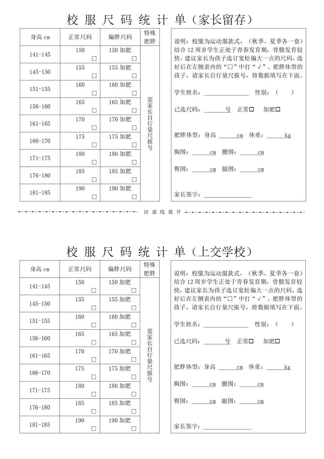 特別說明:特殊體形及肥胖體形的學生到?,F場填寫校服規(guī)格信息,請家長提前量好孩子的身高、體重、胸圍、腰圍、臀圍、腿圍等數據(以厘米為單位),做好記錄,方便現場填寫。