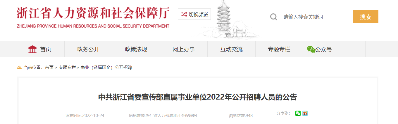 原文標(biāo)題:中共浙江省委宣傳部直屬事業(yè)單位2022年公開招聘人員的公告