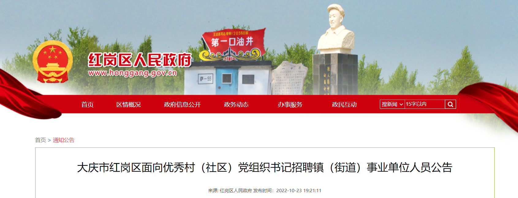 2022年黑龍江省大慶市紅崗區(qū)面向優(yōu)秀村(社區(qū))黨組織書記招聘事業(yè)單位人員公告已發(fā)布。本次招聘采取現(xiàn)場報名方式進(jìn)行,報名時間為本公告發(fā)布之日起至2022年10月28日下午5點(diǎn)?,F(xiàn)將招聘公告原文發(fā)布如下: