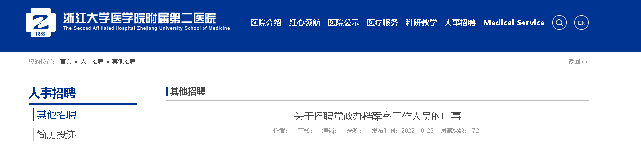 2022浙江大學(xué)醫(yī)學(xué)院附屬第二醫(yī)院招聘黨政辦檔案室工作人員2人,報(bào)名時間:2022年11月8日截止,現(xiàn)將招聘啟事原文發(fā)布如下: