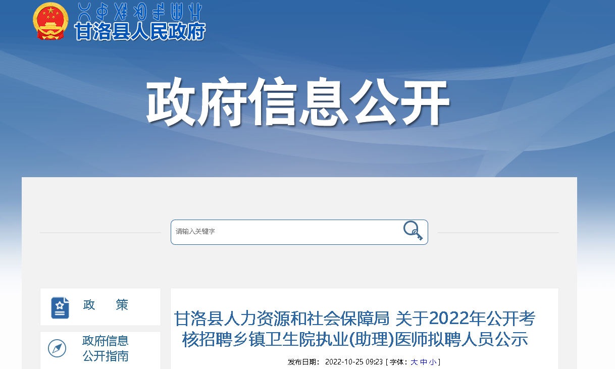 2022四川涼山州甘洛縣考核招聘鄉(xiāng)鎮(zhèn)衛(wèi)生院執(zhí)業(yè)(助理)醫(yī)師擬聘人員公示已出,公示時間:2022年10月25日至10月31日,現(xiàn)將招聘公示原文發(fā)布如下: