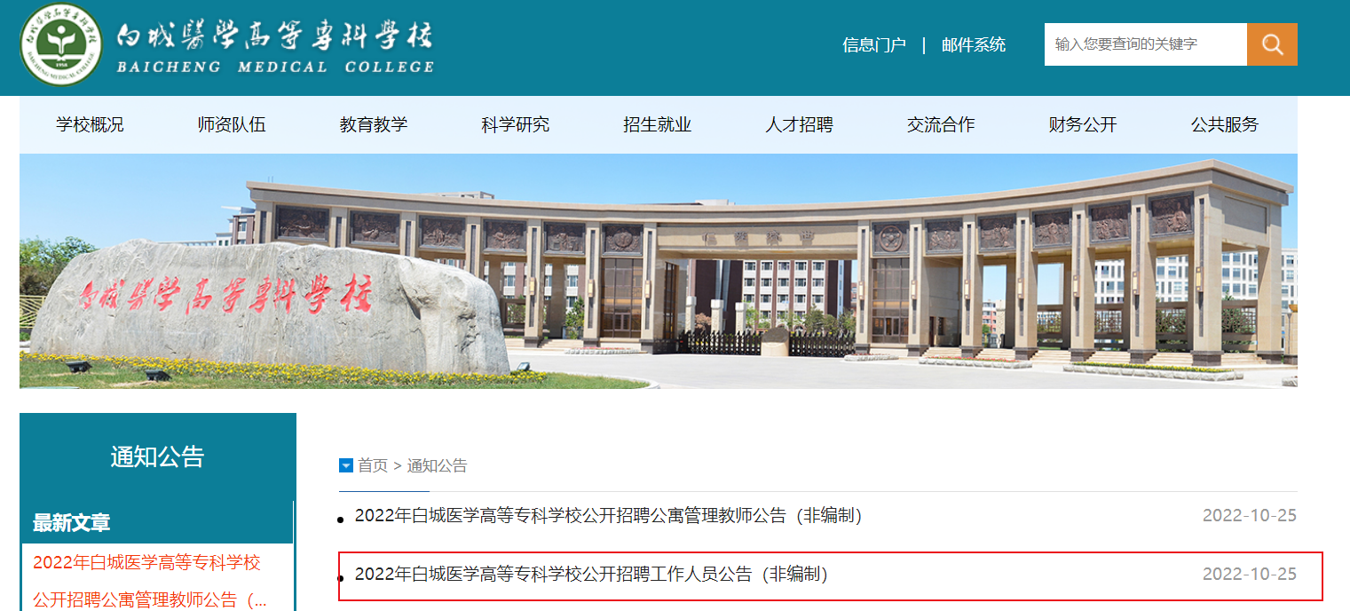 白城醫(yī)學(xué)高等專科學(xué)校(http://www.bcyz.cn/)為本次公告(含補(bǔ)充公告)的發(fā)布網(wǎng)站。學(xué)校官方網(wǎng)站為此次公開招聘的工作網(wǎng)站,有關(guān)招聘事項(xiàng)及各種通知等信息,均通過工作網(wǎng)站進(jìn)行發(fā)布,請考生注意查詢。