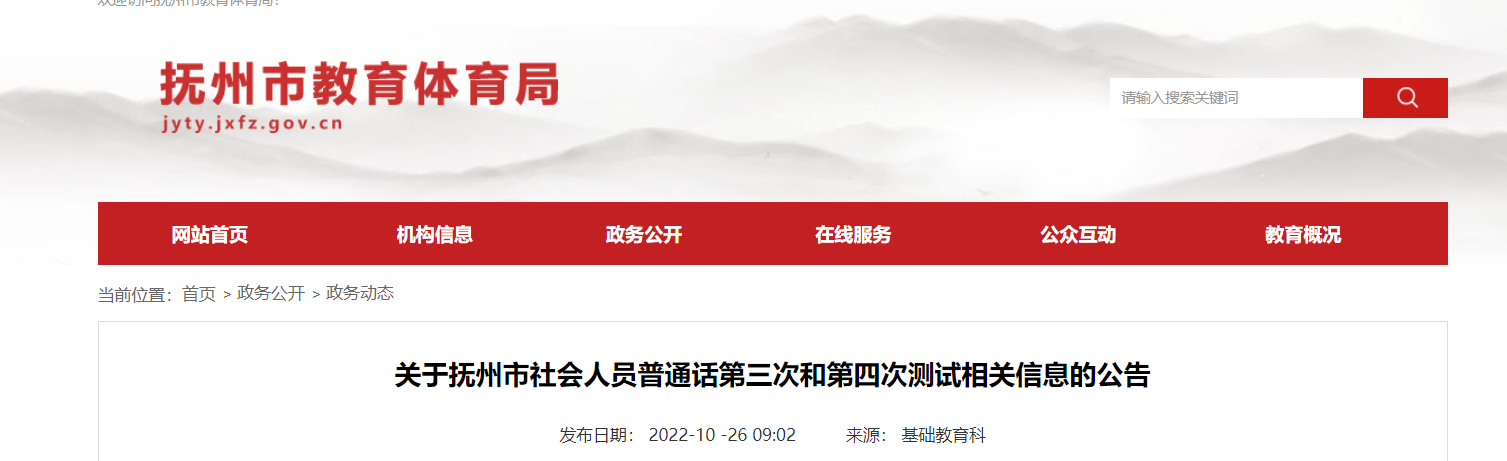 從撫州市教育體育局獲悉,關(guān)于江西撫州社會(huì)人員普通話2022年第三次和第四次測(cè)試相關(guān)信息的公告已公布,請(qǐng)相關(guān)人員仔細(xì)閱讀,具體詳情如下: