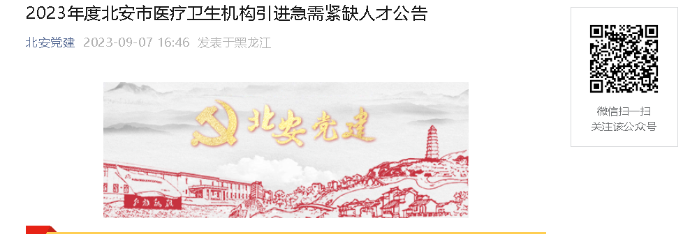 2023黑龍江黑河北安市醫(yī)療衛(wèi)生機(jī)構(gòu)引進(jìn)急需緊缺人才149人,報名截止時間:9月20日,現(xiàn)將招聘公告原文發(fā)布如下: