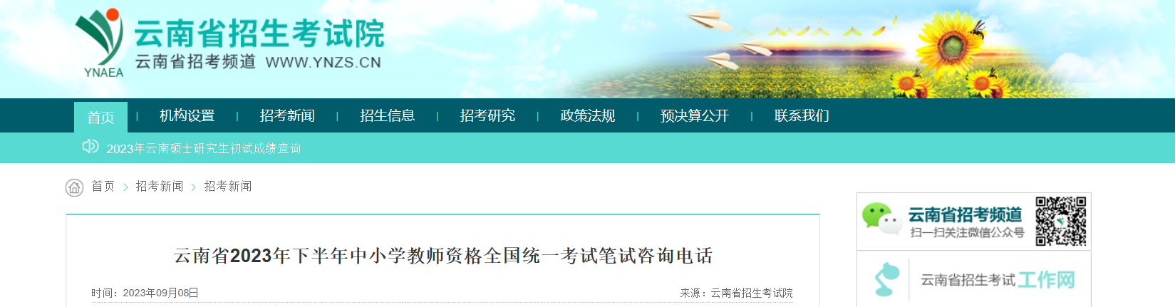 從云南省招生考試院X獲悉,2023下半年云南中小學(xué)教師資格全國統(tǒng)一考試筆試咨詢電話已公布,請相關(guān)人員仔細(xì)閱讀,具體詳情如下: