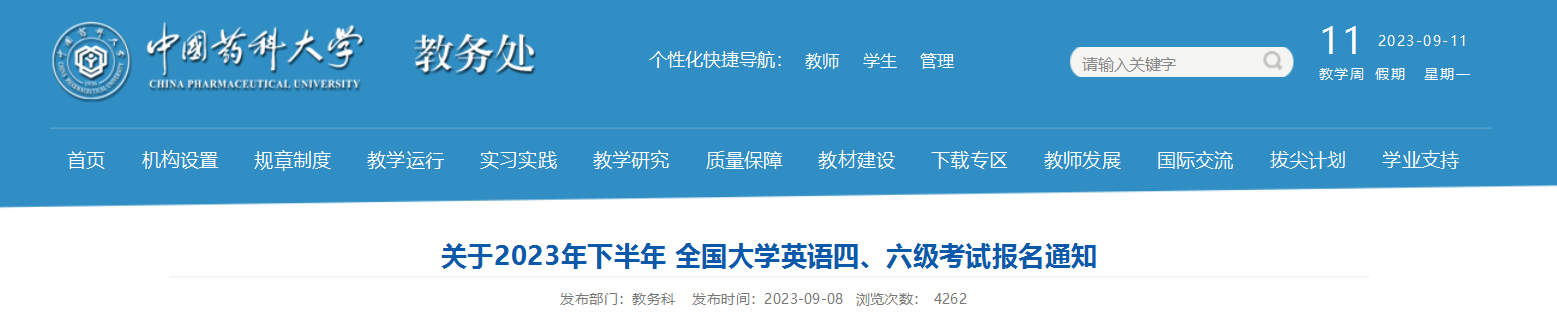 從中國藥科大學教務(wù)處獲悉,2023下半年江蘇中國藥科大學英語四、六級考試報名通知已公布,請相關(guān)人員仔細閱讀,具體詳情如下:
