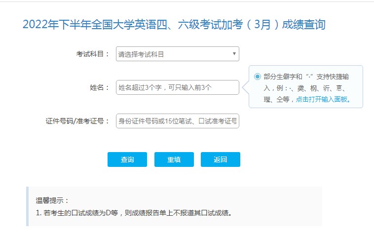 2023年4月25日9時(shí)起,考生可登錄中國(guó)教育考試網(wǎng)(http://cet.neea.edu.cn/cet)查CET6成績(jī),若考生的口試成績(jī)?yōu)镈等,則成績(jī)報(bào)告單上不報(bào)道其口試成績(jī)。目前已支持“考生姓名+身份證件號(hào)碼”的成績(jī)查詢(xún)方式,成績(jī)查詢(xún)結(jié)果中將有準(zhǔn)考證號(hào)。