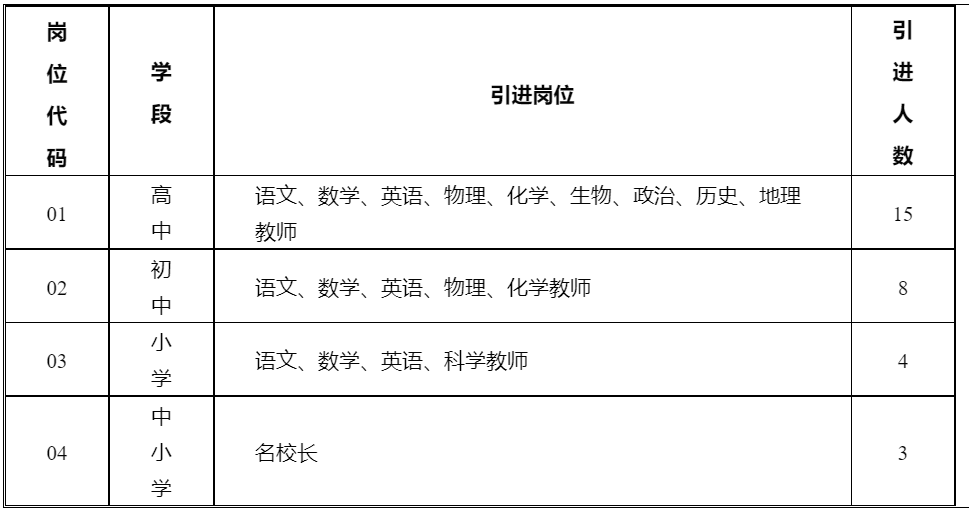 計(jì)劃引進(jìn)30名高層次教育人才,重點(diǎn)需求崗位及引進(jìn)人數(shù)見(jiàn)下表: