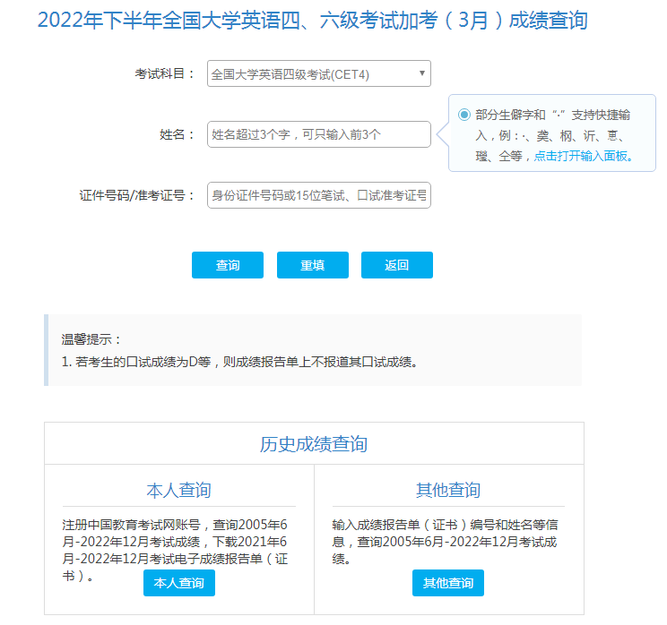 點擊進入>>>2023年3月云南英語六級成績查詢及成績報告單查詢?nèi)肟?BR> 原文標(biāo)題:2022年下半年全國大學(xué)英語四、六級考試加考(3月)成績查詢有關(guān)安排