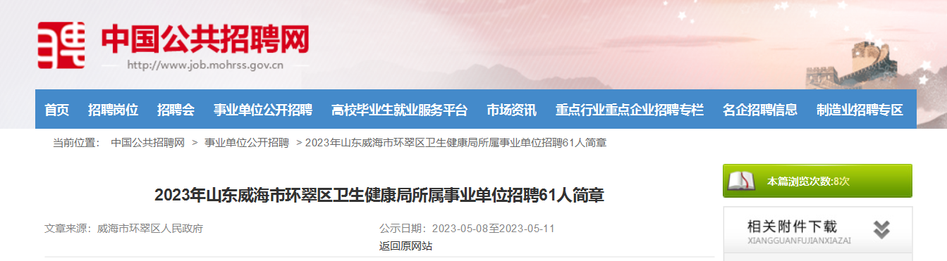 根據(jù)《事業(yè)單位人事管理條例》(國務(wù)院令第652號)、《事業(yè)單位公開招聘人員暫行規(guī)定》(人事部令第6號)等規(guī)定,現(xiàn)將2023年威海市環(huán)翠區(qū)衛(wèi)生健康局所屬事業(yè)單位公開招聘工作人員(含殘聯(lián)康復(fù)醫(yī)療崗位,下同)有關(guān)事項公告如下: