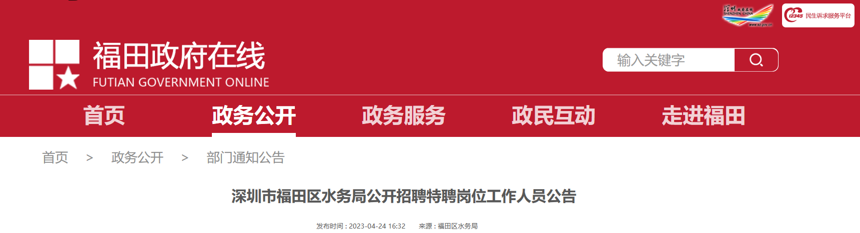 深圳市福田區(qū)水務(wù)局2023年4月招聘特聘崗位