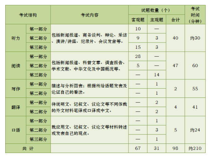 HSK(七—九級)共98題,分聽力、閱讀、寫作、翻譯、口語五部分。全部考試約210分鐘。