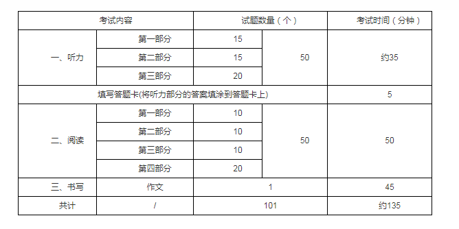 HSK(六級)共101題,分聽力、閱讀、書寫三部分。