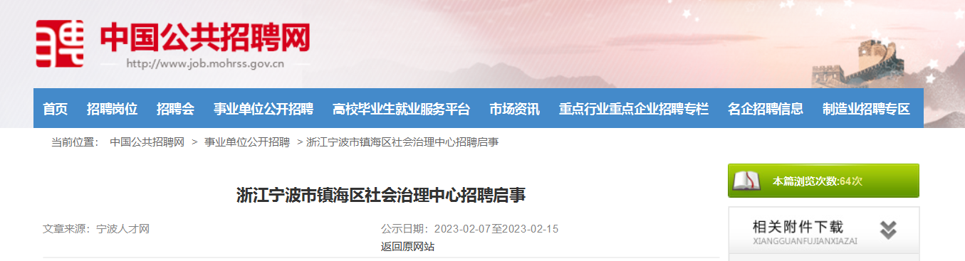 2023年浙江省寧波市鎮(zhèn)海區(qū)社會(huì)治理中心招聘啟事。報(bào)名時(shí)間:即日起至2023年2月15日。現(xiàn)將公告原文發(fā)布如下: