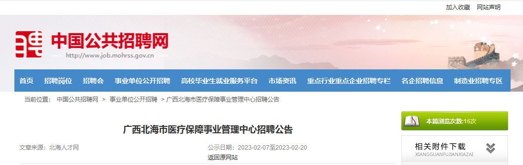 2023廣西北海市醫(yī)療保障事業(yè)管理中心招聘工作人員2名,報(bào)名時(shí)間:2023年2月7日-2月20日,現(xiàn)將招聘公告原文發(fā)布如下:
