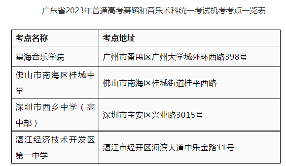 根據(jù)各地市2023年舞蹈和音樂考生人數(shù),結(jié)合機考考試特點,為有效縮短考試周期,方便考生備考文化課和參加部分高校???,我省共設(shè)星海音樂學(xué)院、佛山市南海區(qū)桂城中學(xué)、深圳市西鄉(xiāng)中學(xué)(高中部)和湛江經(jīng)濟技術(shù)開發(fā)區(qū)第一中學(xué)等4個考點。