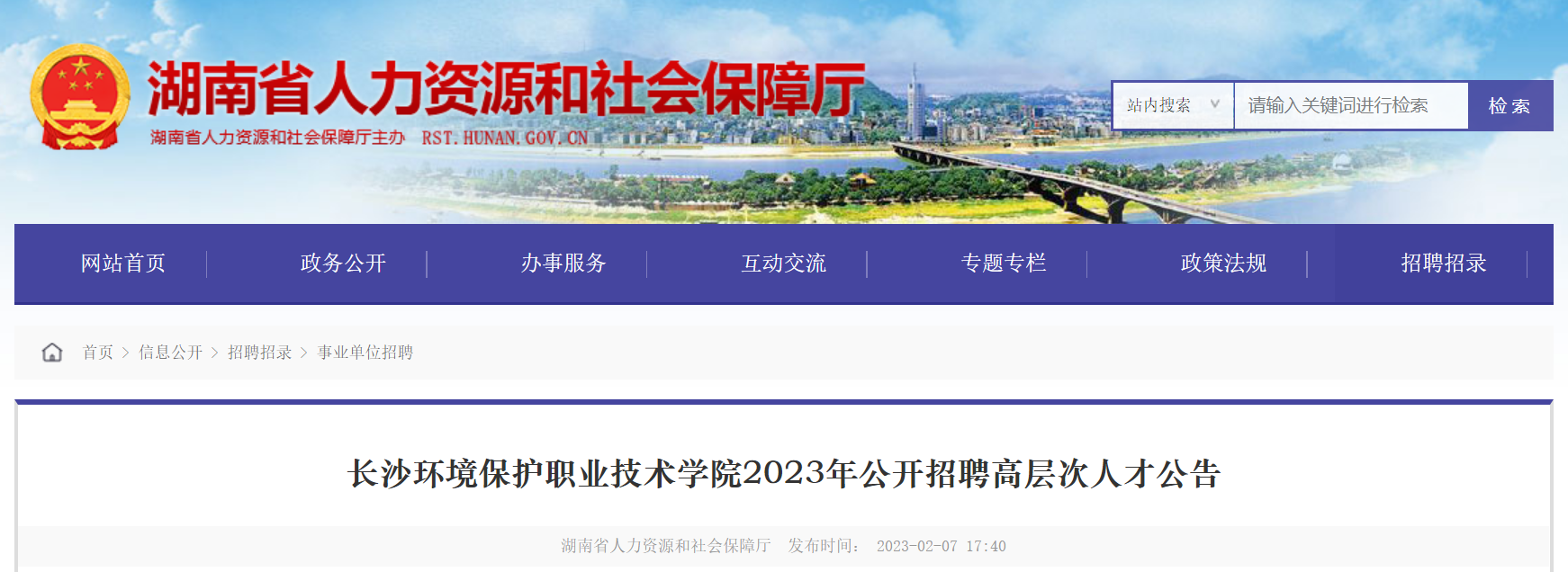 招聘信息通過(guò)湖南省人力資源和社會(huì)保障廳(http://rst.hunan.gov.cn/)、長(zhǎng)沙環(huán)境保護(hù)職業(yè)技術(shù)學(xué)院網(wǎng)站面向社會(huì)公開(kāi)發(fā)布。