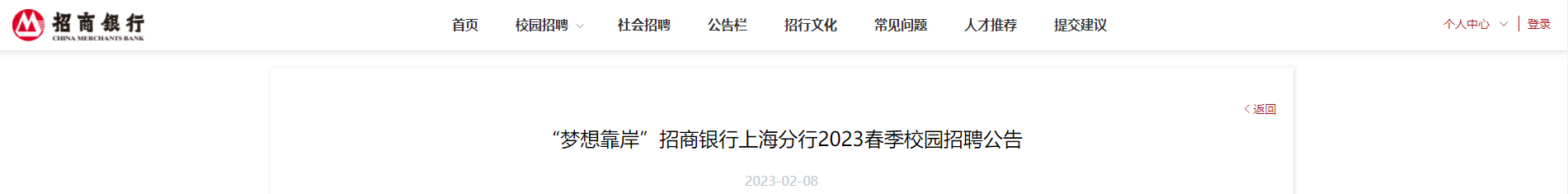 2023年夢(mèng)想靠岸招商銀行上海分行春季校園招聘公告已發(fā)布,現(xiàn)將招聘公告發(fā)布如下: