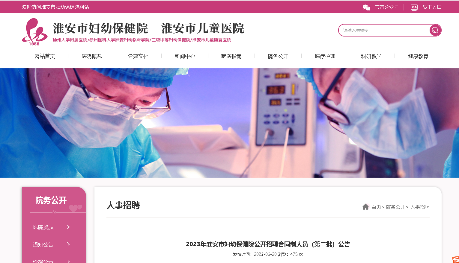 2023年江蘇淮安市婦幼保健院公開(kāi)招聘合同制人員19人,報(bào)名上傳時(shí)間:2023年6月27日08:30-6月29日16:00,現(xiàn)將招聘公告原文發(fā)布如下: