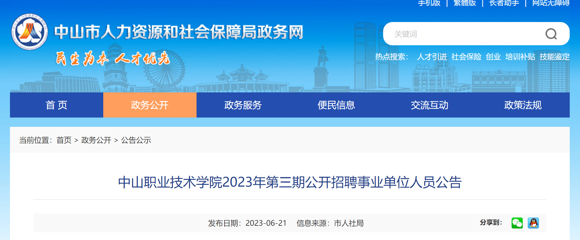 中山職業(yè)技術(shù)學(xué)院是中山市人民政府投資舉辦的全日制普通高等學(xué)校。因?qū)W校發(fā)展需要,決定面向社會公開招聘事業(yè)單位人員。為確保此次招聘工作順利進(jìn)行,根據(jù)《廣東省事業(yè)單位公開招聘人員辦法》(廣東省人民政府令第139號)及有關(guān)文件規(guī)定,現(xiàn)就有關(guān)事項(xiàng)公告如下: