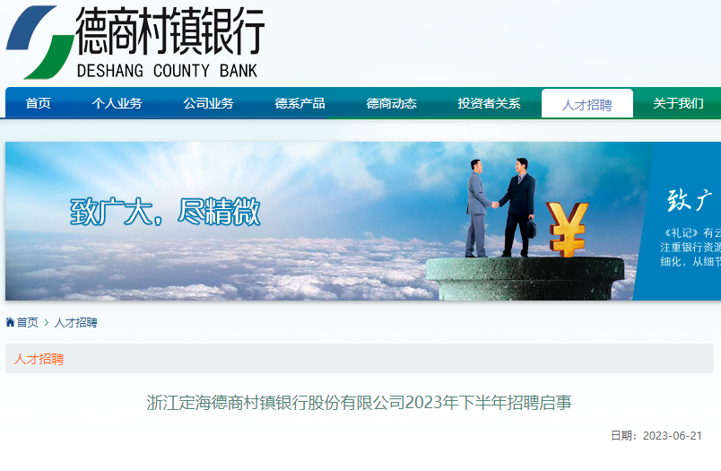 2023年下半年浙江定海德商村鎮(zhèn)銀行招聘啟事已發(fā)布,報名時間:2023年7月11日截止,現(xiàn)將招聘公告發(fā)布如下: