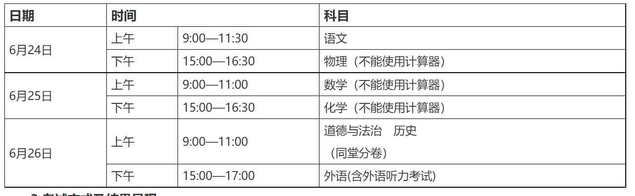 (1)考試方式。道德與法治、語文、數(shù)學、外語、歷史、物理、化學科目實行閉卷紙筆考試,其中外語包含聽力測試。