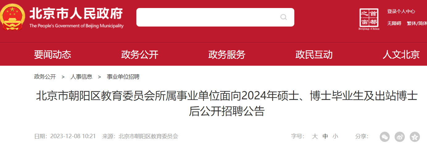 4.各招聘崗位具體條件見《北京市朝陽區(qū)教育委員會所屬事業(yè)單位面向2024年碩士、博士畢業(yè)生及出站博士后公開招聘崗位及要求表》(附件2)。