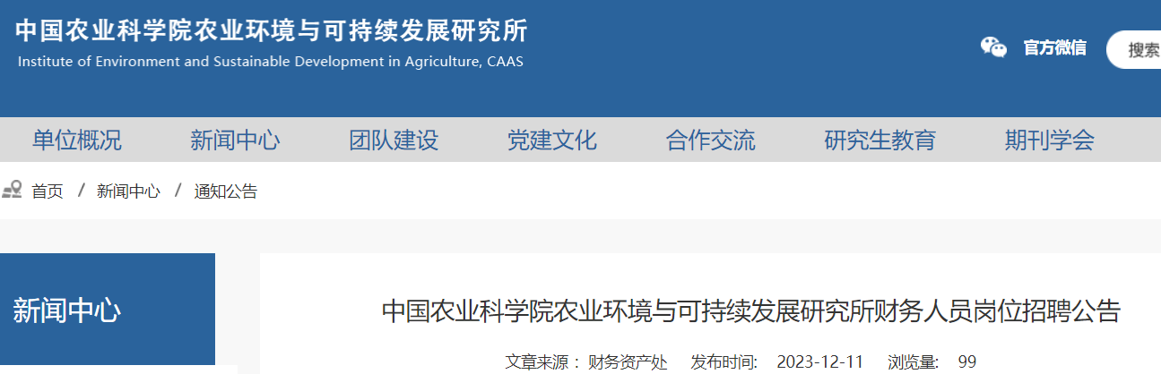 小編根據(jù)中國農業(yè)科學院農業(yè)信息研究所發(fā)布”中國農業(yè)科學院農業(yè)環(huán)境與可持續(xù)發(fā)展研究所財務人員崗位招聘公告“得知,2023中國農業(yè)科學院農業(yè)環(huán)境與可持續(xù)發(fā)展研究所財務人員崗位招聘1人,報名時間2023年12月15日17:00。