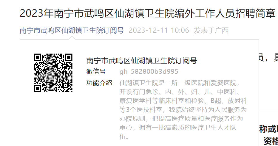 2023年廣西南寧市武鳴區(qū)仙湖鎮(zhèn)衛(wèi)生院招聘編外工作人員4名,報(bào)名時(shí)間:2023年12月11日至2023年12月15日(共5個(gè)工作日)?,F(xiàn)將招聘公告原文發(fā)布如下: