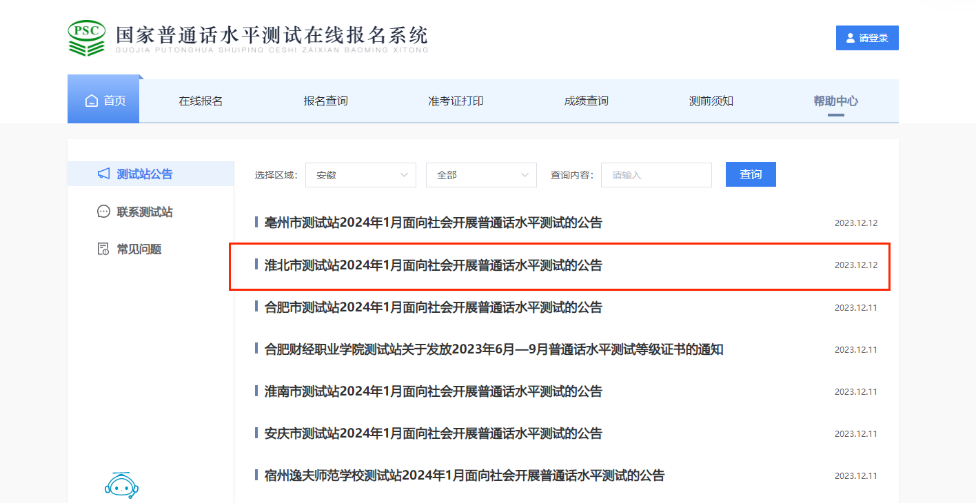 從國(guó)家普通話水平測(cè)試在線報(bào)名系統(tǒng)獲悉,2024年1月安徽淮北普通話報(bào)名時(shí)間及考試時(shí)間已公布,報(bào)名時(shí)間12月25日起,考試時(shí)間暫定1月13日起,具體詳情如下: