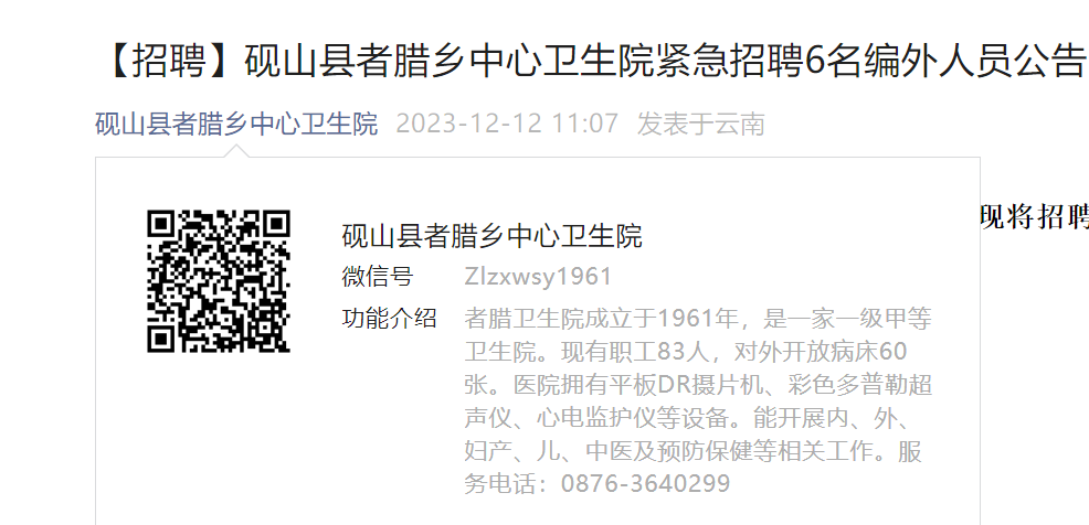2023年云南文山硯山縣者臘鄉(xiāng)中心衛(wèi)生院緊急招聘編外人員6人,報(bào)名時間:2023年12月12日至招滿為止。現(xiàn)將招聘公告原文發(fā)布如下: