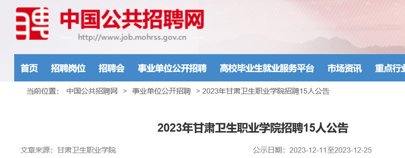 小編根據(jù)中國公共招聘網(wǎng)發(fā)布"2023年甘肅衛(wèi)生職業(yè)學(xué)院招聘15人公告"得知,2023年甘肅衛(wèi)生職業(yè)學(xué)院招聘15人,報(bào)名時(shí)間為12月11日至12月25日。