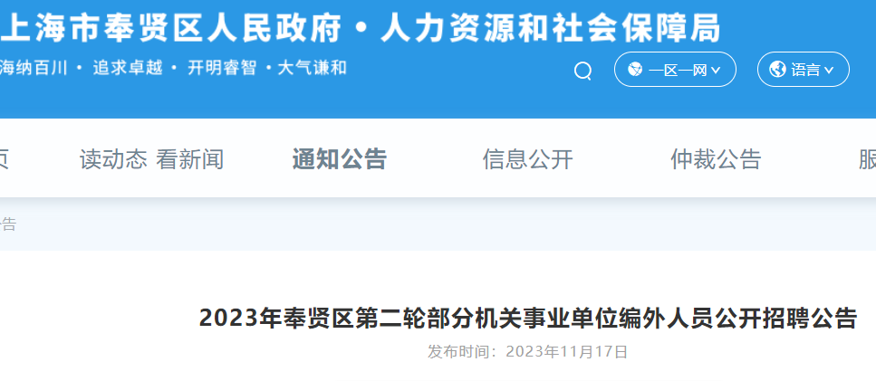 小編根據(jù)奉賢區(qū)人力資源和社會(huì)保障局發(fā)布“2023年奉賢區(qū)第二輪部分機(jī)關(guān)事業(yè)單位編外人員公開招聘公告”得知,2023上海奉賢區(qū)第二輪部分機(jī)關(guān)事業(yè)單位編外人員招聘29人,報(bào)名時(shí)間為11月20日-11月22日。