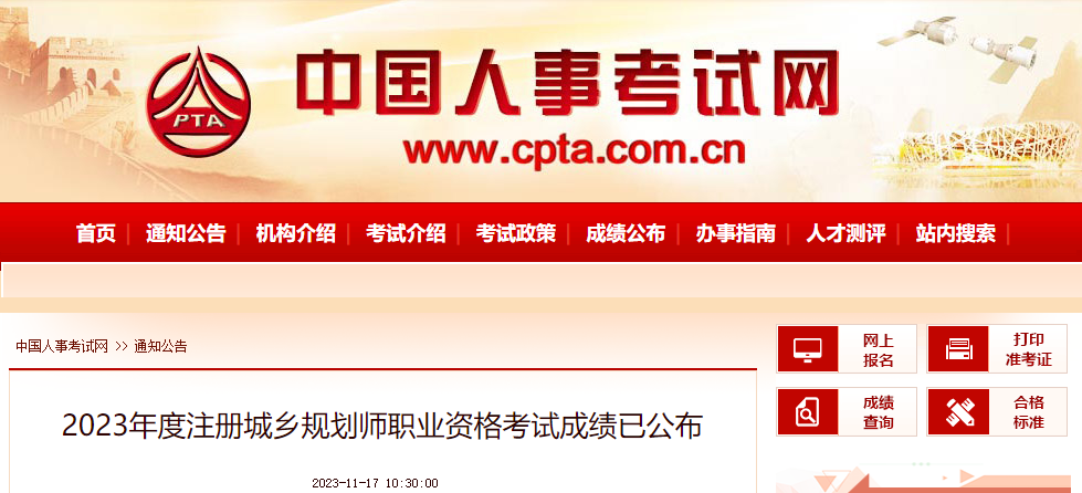 2023年貴州注冊(cè)城鄉(xiāng)規(guī)劃師職業(yè)資格考試成績(jī)于2023年11月17日公布。請(qǐng)考生到本網(wǎng)站“成績(jī)查詢”欄目進(jìn)行查詢。
