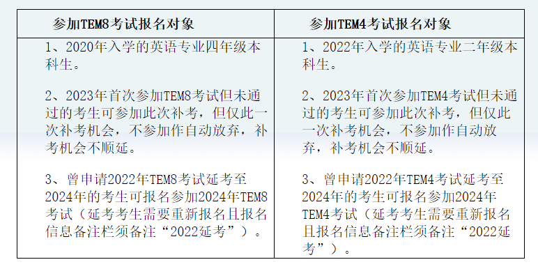 根據(jù)高校外語專業(yè)教學測試辦公室《2024年全國高等學校英語專業(yè)四、八級考試(TEM)報考須知》通知要求,現(xiàn)將我校2024年英語專業(yè)四級(TEM4)、八級(TEM8)報名及考試安排等有關事項通知如下: