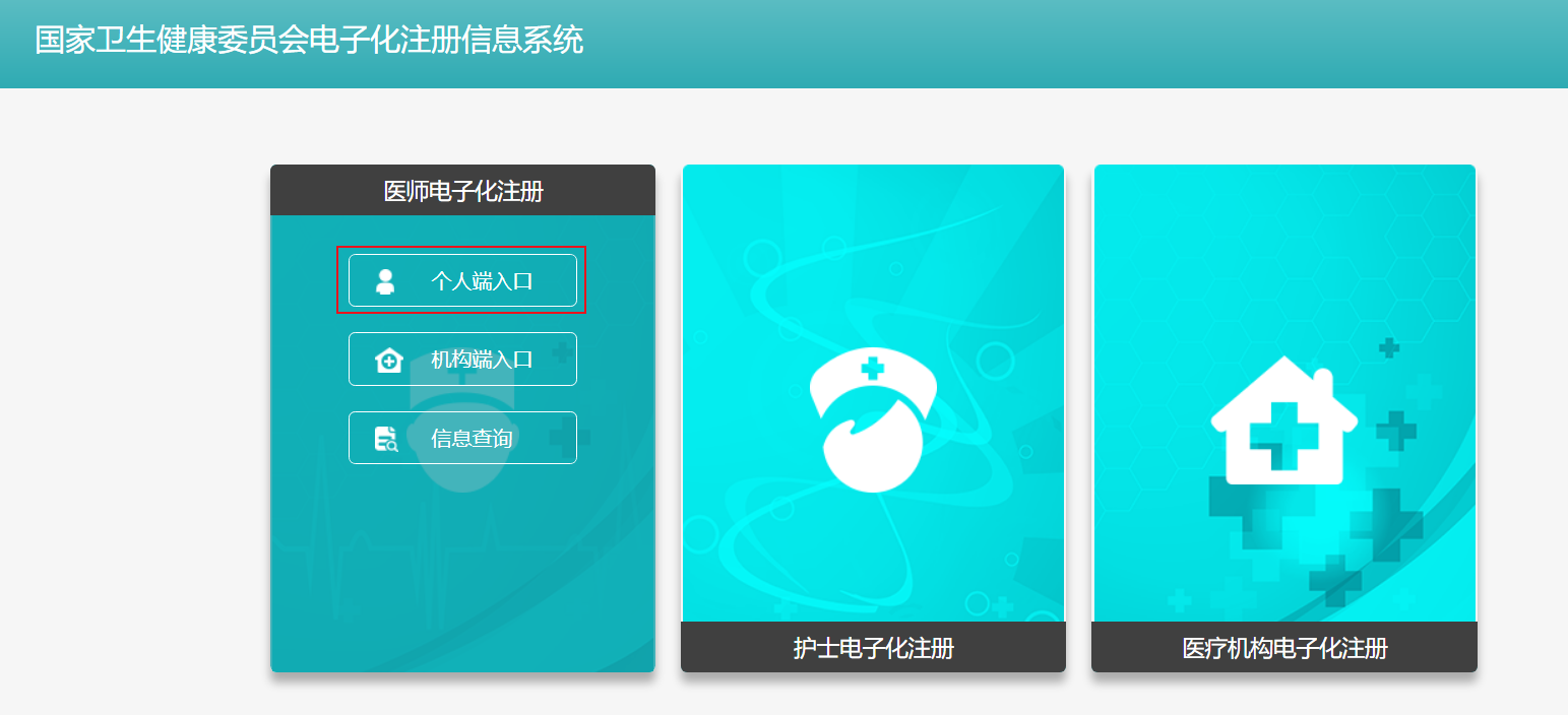 2、在“國家衛(wèi)生健康委員會電子化注冊信息系統(tǒng)”頁面,點擊“醫(yī)師電子化注冊--個人端入口”。