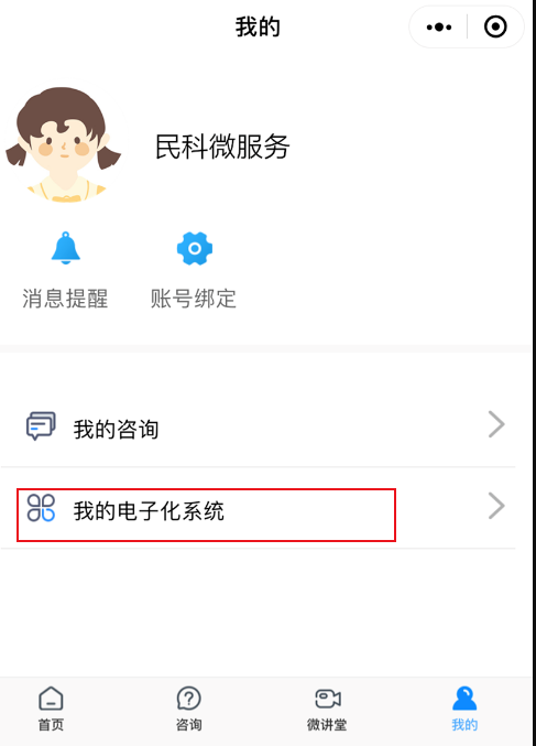 1、在民科微服務(wù)小程序【我的】中,點擊【我的電子化系統(tǒng)】
