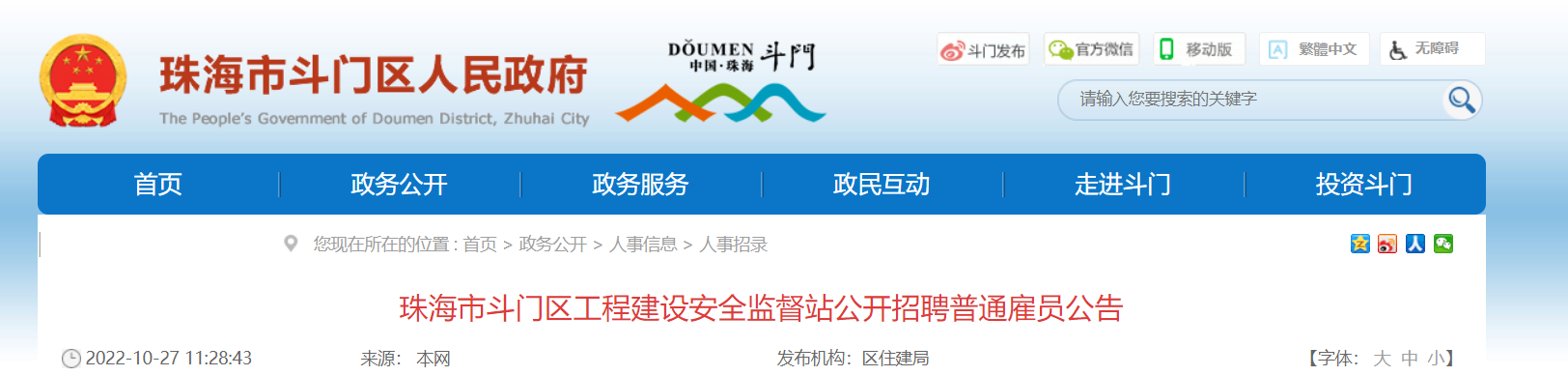 原文標題:珠海市斗門區(qū)工程建設(shè)安全監(jiān)督站公開招聘普通雇員公告