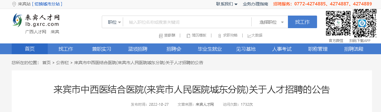 原文標題:來賓市中西醫(yī)結(jié)合醫(yī)院(來賓市人民醫(yī)院城東分院)關(guān)于人才招聘的公告