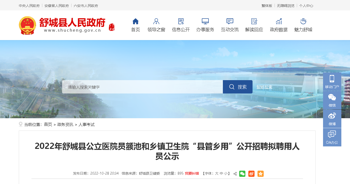 2022安徽六安市舒城縣公立醫(yī)院?jiǎn)T額池和鄉(xiāng)鎮(zhèn)衛(wèi)生院“縣管鄉(xiāng)用”招聘擬聘用人員公示已出,公示時(shí)間:2022年10月28日-11月3日,現(xiàn)將招聘公示原文發(fā)布如下: