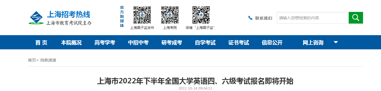 從上海市教育考試院發(fā)布的《上海2022下半年全國大學(xué)英語四六級考試報名即將開始》得知,2022下半年上海英語六級報名時間、條件、費用及入口已公布,即日起報名(10月底已啟動),具體詳情如下: