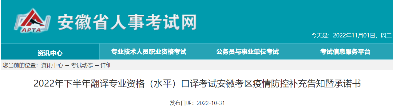 原文標(biāo)題:2022年下半年翻譯專業(yè)資格(水平)口譯考試安徽考區(qū)疫情防控補(bǔ)充告知暨承 諾書