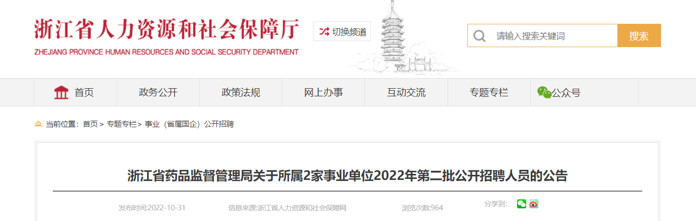 原文標(biāo)題:浙江省藥品監(jiān)督管理局關(guān)于所屬2家事業(yè)單位2022年第二批公開(kāi)招聘人員的公告