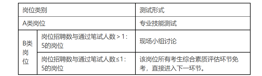 綜合素質(zhì)評估主要采取專業(yè)技能測試、小組討論等形式對考生進行考察。各崗位具體考核形式見下表。