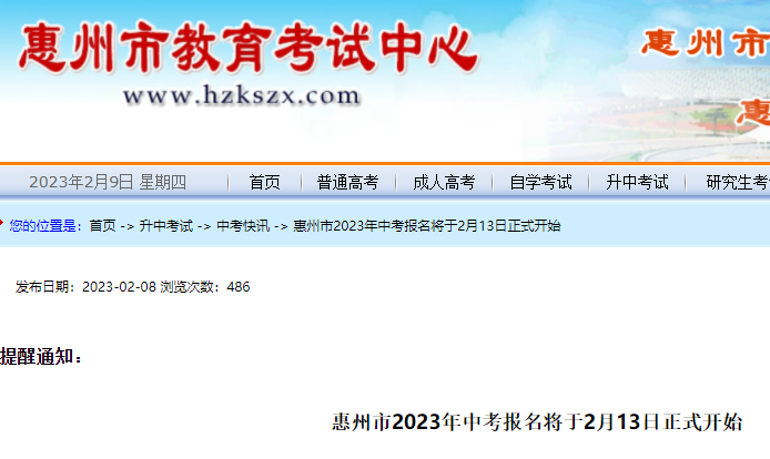 中考頻道從惠州市教育考試中心了解到,2023年廣東惠州中考報(bào)名將于2月13日正式開始,具體如下: