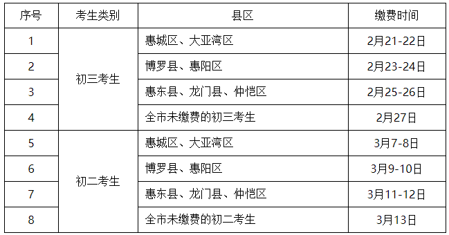 繳費(fèi)時(shí)間:初三考生2月21-27日,初二考生3月7-13日
